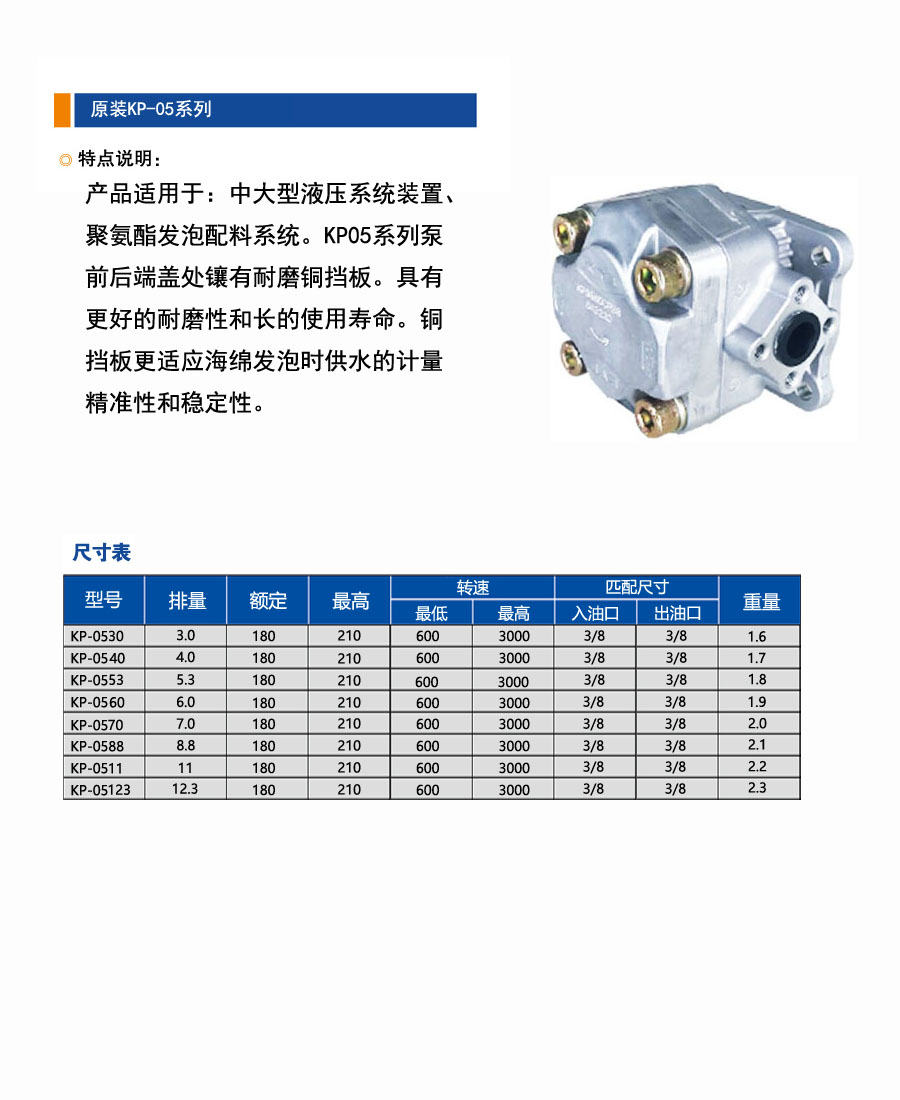 产品适用于:中大型液压系统装置、聚氨酯发泡配料系统。KP05系列泵前后端盖处镶有耐磨铜挡板。具有更好的耐磨性和超长的使用寿命。铜挡板更适应海绵发泡时供水的计量精准性和稳定性